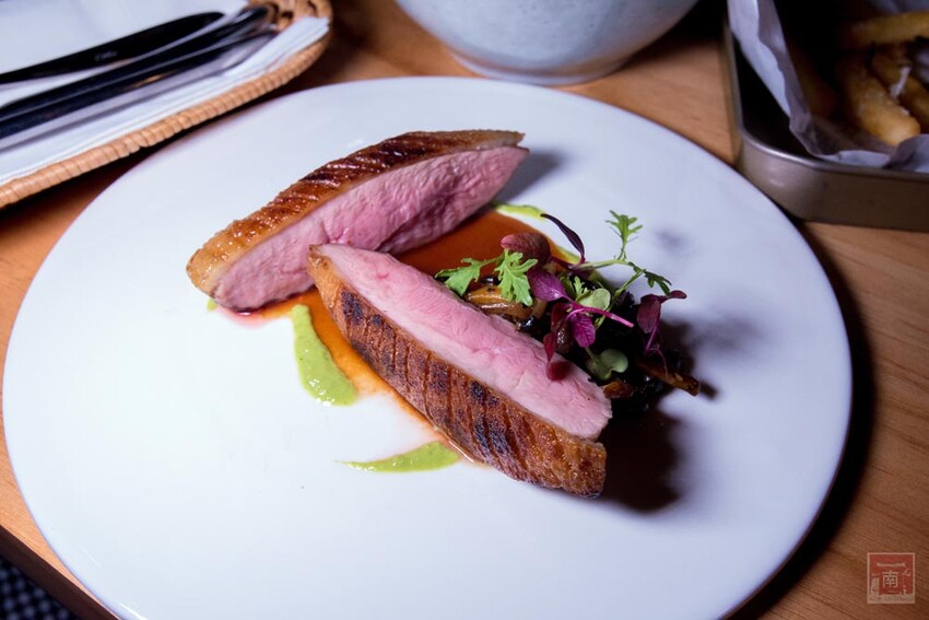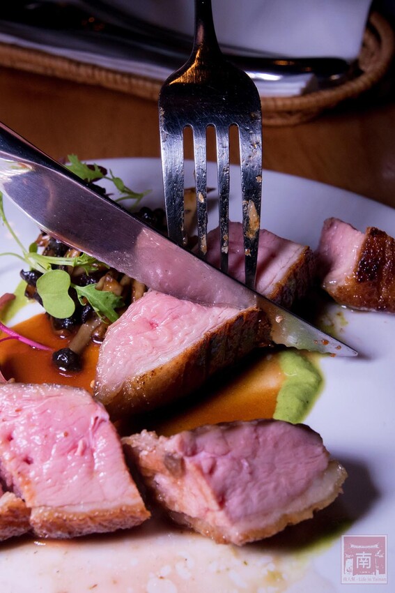『熟成鴨胸($450/份)』完全不像鴨胸,外層表皮脆,再往下一層是Q,最裡面粉紅色軟嫩的肉質很軟,配配松露野菇及青蔥醬。
