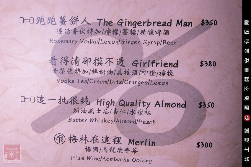 『漫草玖零餐酒館』是我還滿喜歡的一家餐酒館,bartender用著創意及烹調食材的手法做結合,調出一杯杯特色調酒,而且餐點也顛覆一般酒館只有提供輕食、炸物的想像,在漫草玖零像是西式餐點,從前菜、主菜到套餐在這裡都可以點上,而且也有有酒精和無酒精的特調飲品。《未成年請勿飲酒》