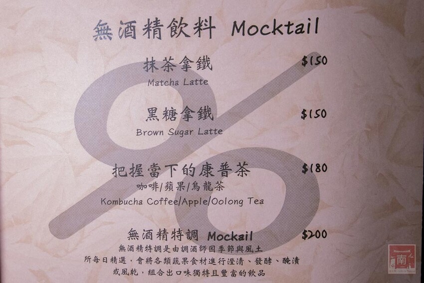 『把握當下的康普茶($180/杯)』康普茶其實不是茶,而是一種活菌飲品,康普茶最早出現在公元前 220 年中國滿州,而在2016 年開始也在歐美盛行,很多好萊塢的明星都很喜歡這個味道。康普茶又叫冬菇茶、紅茶菌,在加糖的茶中混合細菌和酵母發酵而成。康普茶是非酒精的發酵飲品,屬於無酒精飲料,所以也受到許多人的喜愛。但想不到在餐酒館也能喝到這款無酒精飲料,康普茶的發酵基底多數採用茶葉發酵,喝起來帶點微氣泡感,而且味道超特別,我們點了蘋果和烏龍茶口味,蘋果康普茶則帶著蘋果汁的口感,而烏龍茶帶著茶韻香氣。