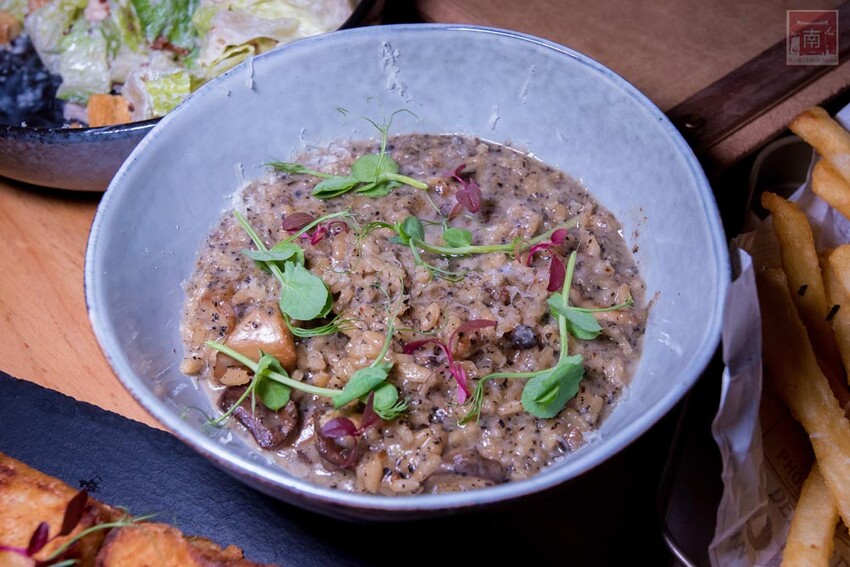 『松露燉飯($380/份)』大人和小孩都會喜歡的燉飯,一上桌是濃郁的松露香氣,米粒保留了米心,使用義大利米烹煮,每一粒米都沾上了濃郁的松露醬,配料是多汁的菌菇。