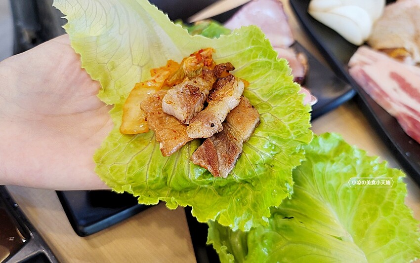 將生菜包入豬五花、泡菜一起吃,入口不感油膩,吃起來爽口又JUICE,完全讓我有種時空的交錯感覺,我正在韓國吃生菜包肉XD