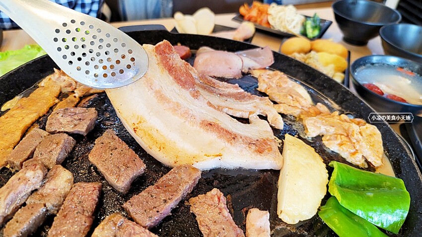 接下來就來看看小涼與姊妹兩人都吃了啥吧!肉鮮生以韓國原裝鑄鐵鍋來取代一般烤盤,雖然在更換上比較費工夫,但這種鍋的好處就是受熱均勻,讓肉品烤起來更美味,而且還可以在上面拌炒不少韓式料理,如辣炒魷魚、泡菜豬肉、炒染菜、泡菜炒飯等等客製化美食呢