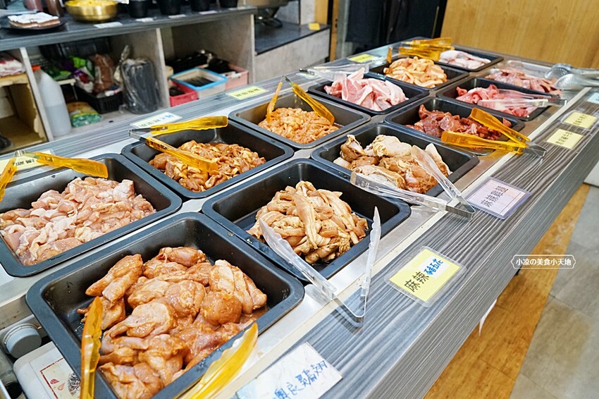 大食量的朋友有福了!!!這裡是肉食者的天下!很難想像是吃到飽供應的肉品,可以看到肉是有厚度的,不會刻意切薄!!吃韓式烤肉最不能或缺的就是這原味豬梅花,有偏瘦也有類似豬五花的肥嫩部位,還有魚下巴(左上),香腸、魷魚以及唐揚雞丁..