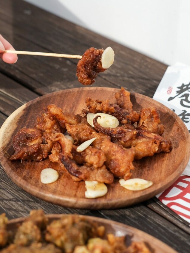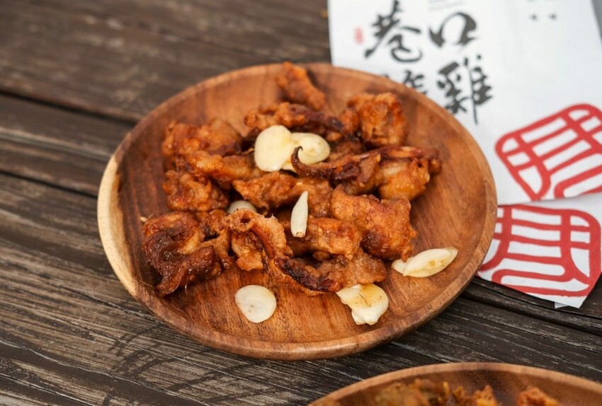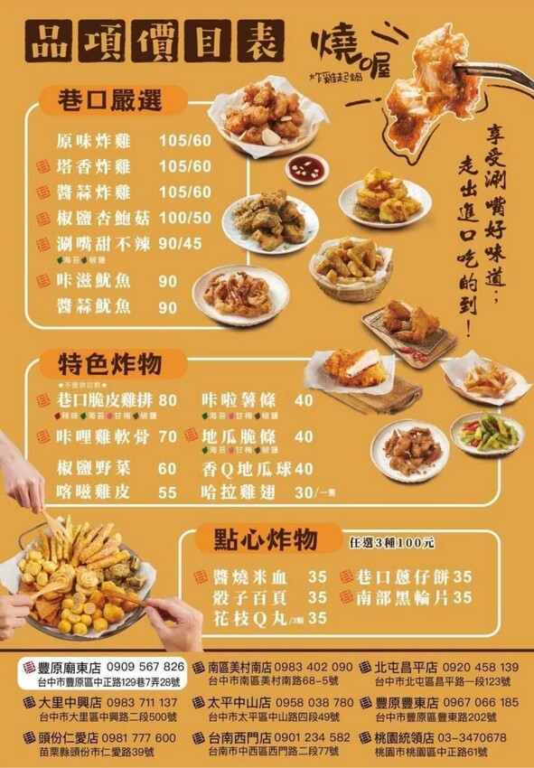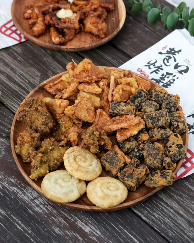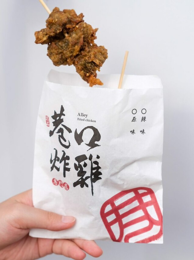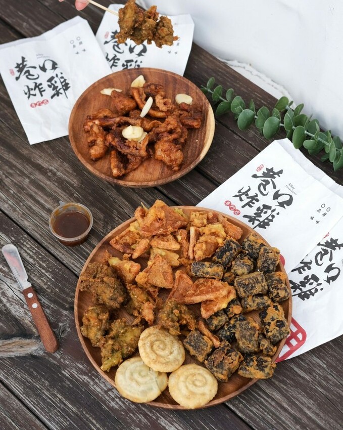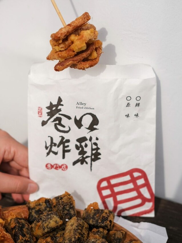 【巷口炸雞】的品項以招牌炸雞為主打,推出塔香、醬蒜、原味三種口味,同時供應雞排、魷魚、杏鮑菇、薯條、米血、百頁,到少見的蔥仔餅、地瓜球、花枝Q丸等通通都有,有配合外送平台和LINE自取的服務。