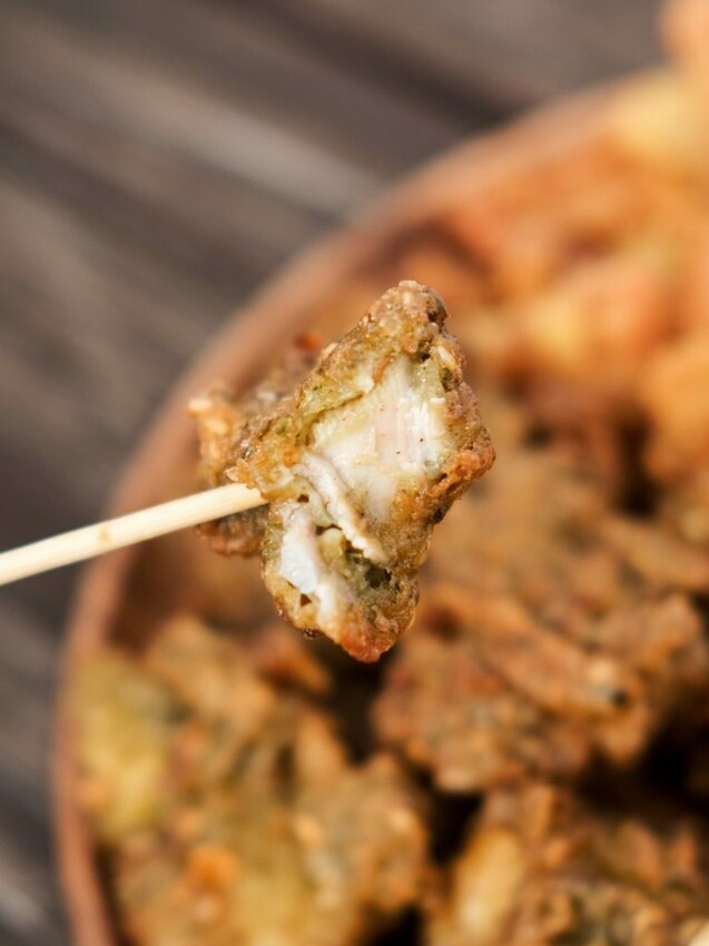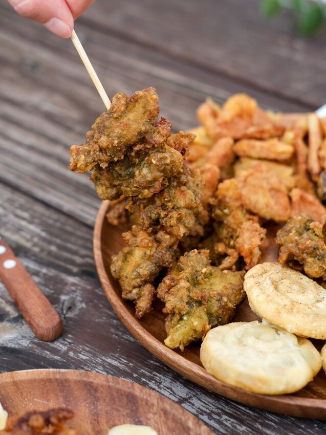 ▼將九層塔加入麵糊中醃製雞肉,剛起鍋時就能聞到濃郁的塔香,從炸皮上也有清楚可見的碎九層塔。