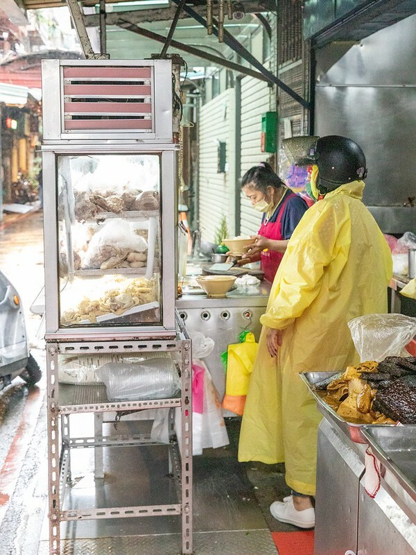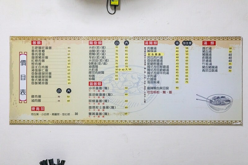 阿華肉羹沒開,隔壁的原味豆漿燒餅也沒了,只好憑直覺走進一開始覺得應該什麼也沒有,卻意外遠遠看到煮麵水蒸氣的小攤。停下腳步是因為有幾個人冒著雨騎著機車、穿著雨衣在門口排隊,而後是因為menu上的沙茶蓋飯,因為看起來明明是賣麵和黑白切的小攤。進而....