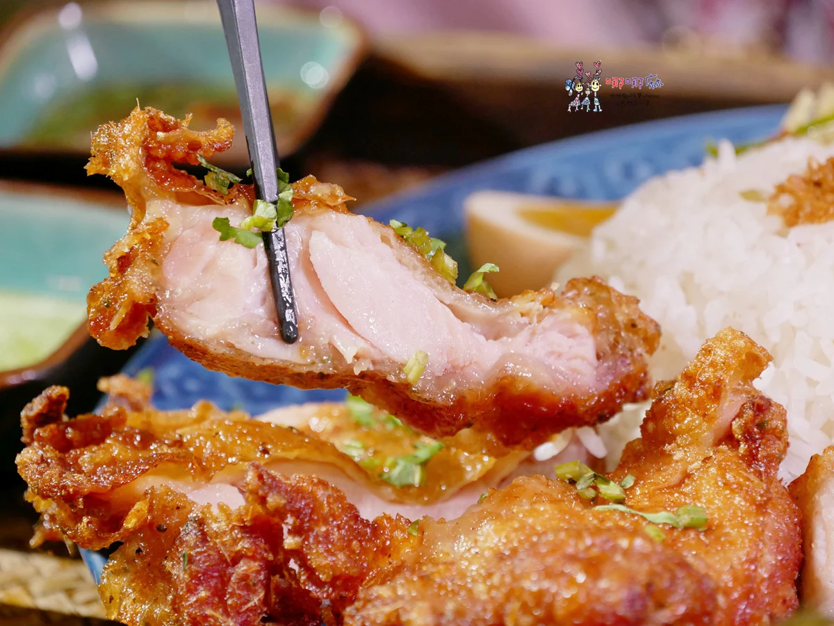 這是好咖 Thai 最近推出很適合做外帶便當的品項,脆皮豬和椒麻雞兩種都有,還附了一小坨青木瓜絲和一個雞肉丸。如果要和小孩分食可以像我們這樣請店家把醬料另外裝,要吃的時候再沾一些就好了。