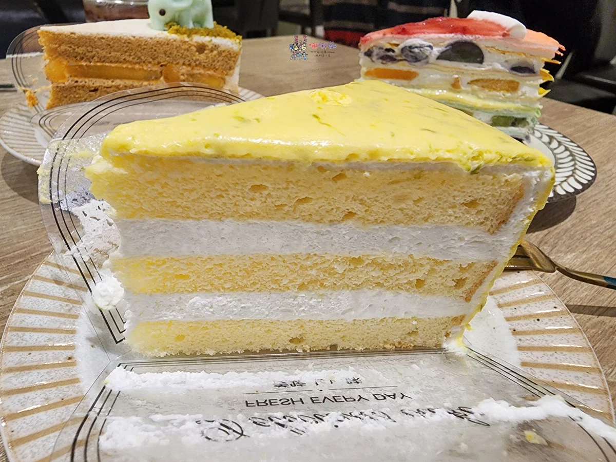 店家推薦的是他們最近新出的檸檬蛋糕,香草戚風蛋糕體淋上檸檬糖霜,可以吃到戚風的軟綿又有檸檬糖霜的酸甜,中間的北海道生乳奶油吃起來清爽不膩,這個蛋糕蠻超乎我的想像的,吃完一片感覺毫不費力。