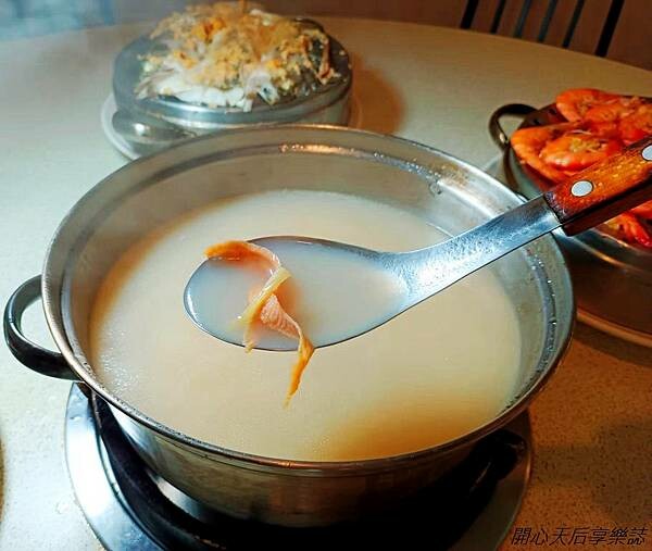 吃完火鍋料後,店員加入使用大骨、雞骨、蝦米熬煮而成的高湯,融合海陸精華湯底,加入白飯、蛋、蔥花、蒜酥/油蔥酥