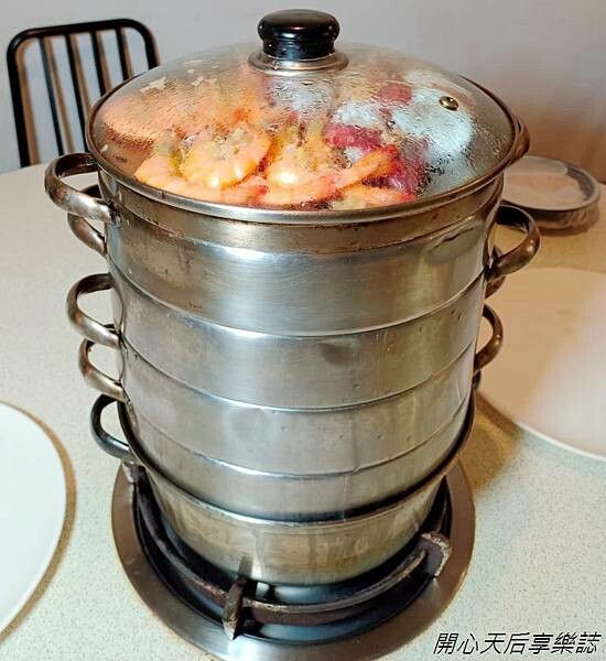 點了套餐後,沒等多久,海鮮塔就蒸熟上桌了,放在桌上的小火爐,由店員一層一層地拿到早已擺放在桌上的大圓盤,每一層看起來都好有料