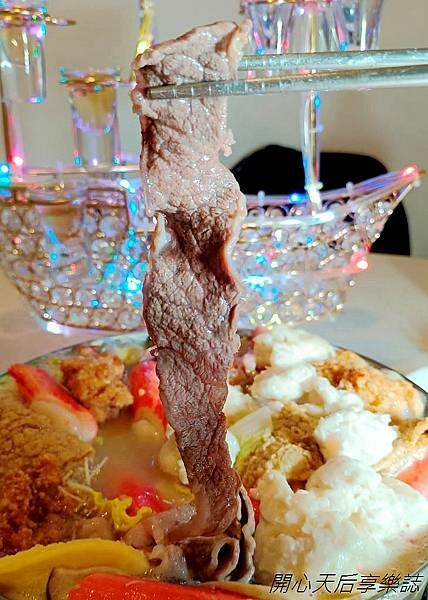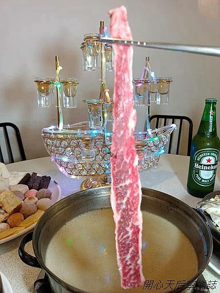 我們5個人點了肆人套餐$2988+10%,餐點包含小層海鮮4層/台灣產肉品5份/汕頭高湯/精選菜盤/頂級火鍋料/白飯/王子麵/冬粉,加送活動贈送的蛤蠣一盤及閃亮亮的七彩戰艦繽紛香檳船,特製水晶船滿載多杯香檳汽水,而且不停閃爍、變換著七彩燈光,超好看!整桌全滿,好澎湃!