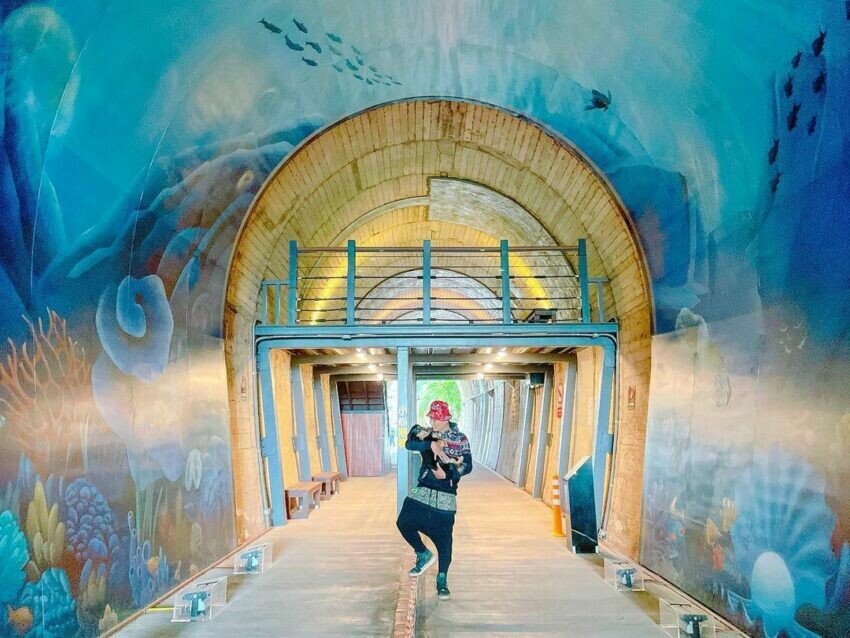 舊隧道點燃燈光,映照出海底光雕彩繪牆,可看到生動的海豚、水母、珊瑚礁生動地浮現在隧道中,讓人彷彿進到海底世界。這是台鐵舊隧道「蘇東隧道」,每半小時就會點燈十分鐘。隧道全長68米並不長,如果有途經此處,可以順道來看看看哦!