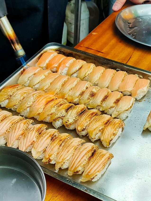 我們三點四十幾分到現場的時候,老板正在炙燒著鮭魚呢