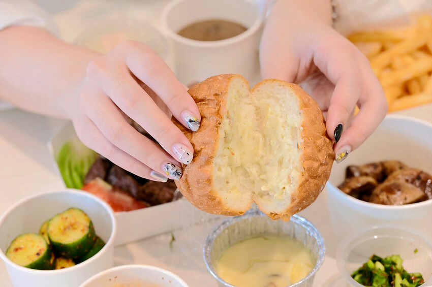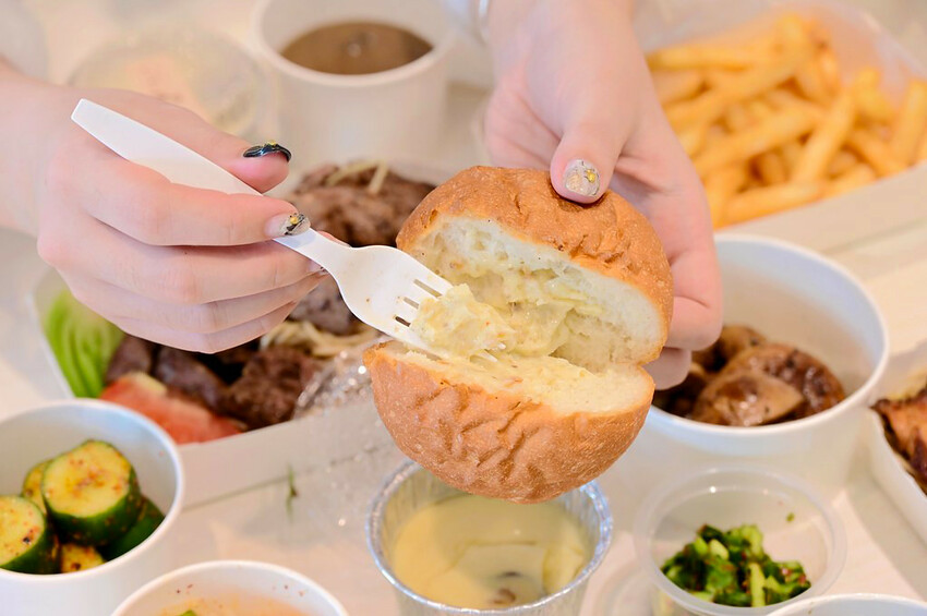 隨排餐還有附上法國麵包球,但其實麵包有兩種,除了軟法麵包以外還有比較鬆軟的現烤麵包可選,附上的蕈菇奶油醬很好吃又濃郁,麵包也蠻大一個的。湯品部份有玉米濃湯跟羅宋湯,玉米濃湯表現正常,羅宋湯偏酸甜些,