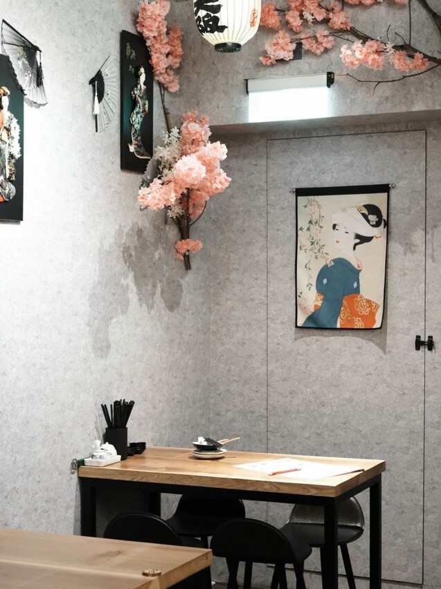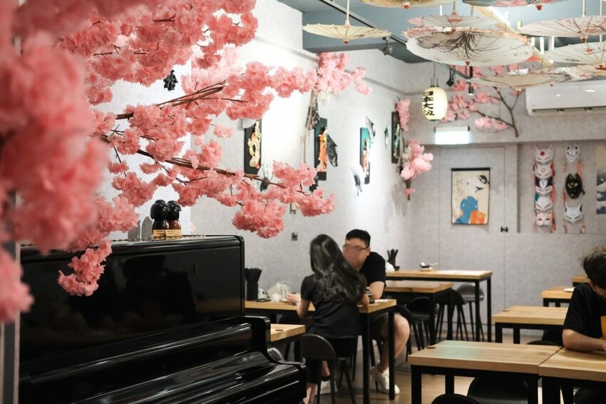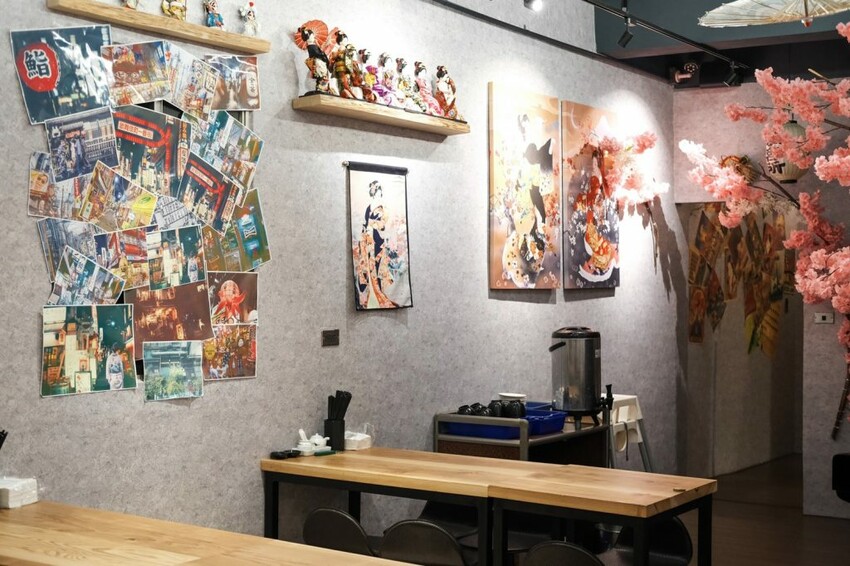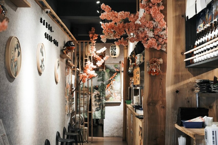 ▼【九屋太平の聚客所】為狹長形的空間格局,延續店外的日式風格,在粉嫩櫻花的點綴裝飾之下充滿氛圍,可以看到開放式的衛生廚房,走到底則有個較為寬廣的空間,能夠同時容納四人及六人團體聚餐。