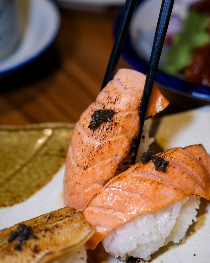 ▼炙燒焦糖鮭魚的肉質細膩,散發著迷人的油脂香氣,炙燒牛五花咬起來軟嫩,同時擁有濃郁的牛肉味道,炙燒星鰻塗上特製的醬汁燒烤後,放入口中帶來獨特的香氣與甜味。