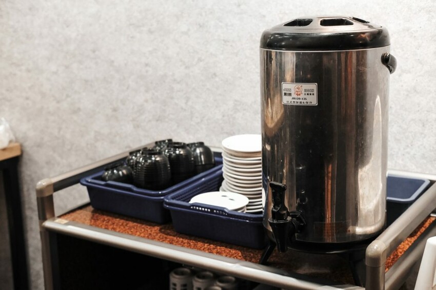▼【九屋太平の聚客所】的自助區提供碗筷,還有免費無限享用的綠茶可飲用,用餐不另外收取一成服務費。