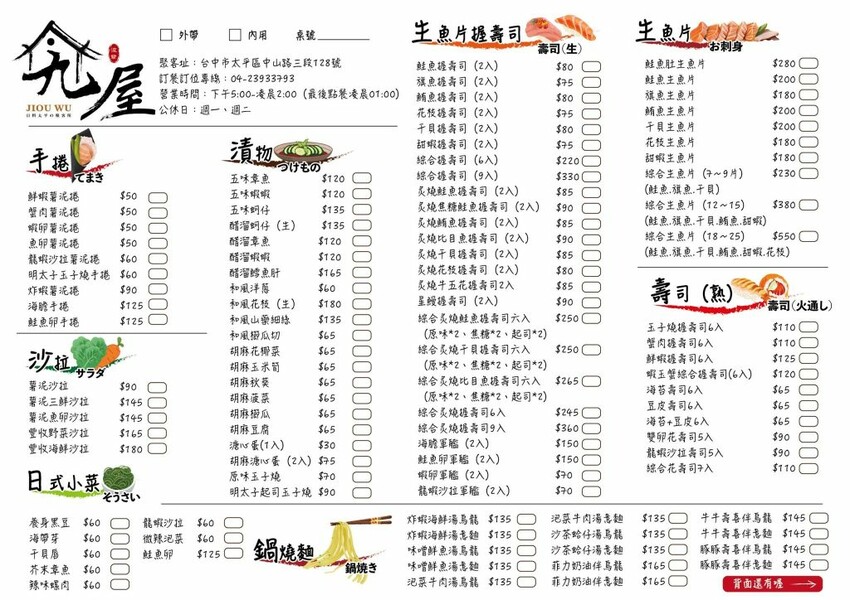 【九屋太平の聚客所】的餐點以日式料理為主打,包含手捲、開胃沙拉、漬物、生魚片、刺身、串物、烤物、湯品、揚物、炸物、壽司等,擁有將近200種的豐富選擇,可以想到的日料通通都有,價位走的是親民路線,全品項最貴的餐點不超過550元。