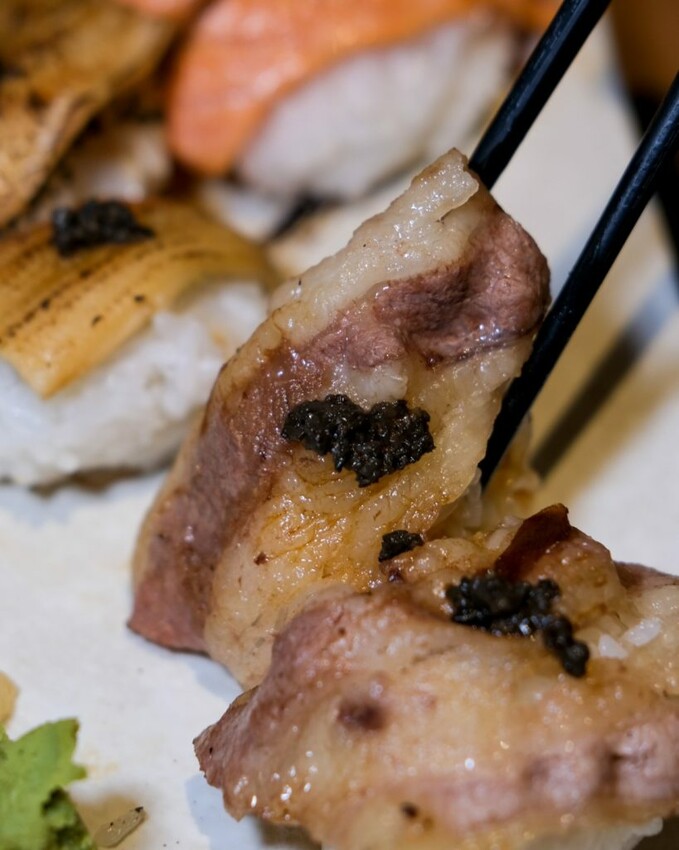 ▼炙燒壽司系列每份共有兩貫,肥厚尺寸約是外面的1.5倍,搭配頂頭的松露醬風味更佳,口感吃起來也更有滿足感。
