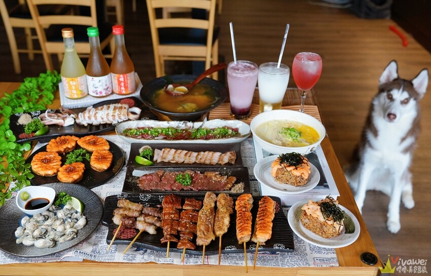 ▲我們這天到「毛起來喫寵物友善居酒屋」點了店家搭配好的雙人豪華餐,內容物有:毛起來喫生牛肉、明太子魚卵馬鈴薯、極鮮彈牙軟絲、安格斯炭燒牛排、焦香松阪豬、一晚鮮蚵、牛肉剝皮辣椒兩串、脆皮肥腸兩串、招牌鹽烤雞腿兩串、明太子雞腿肉兩串、奶油金針菇、明太子烤飯糰、龍蝦沙拉烤飯糰、大碗味噌湯、北海道糯米麻糬串兩串!