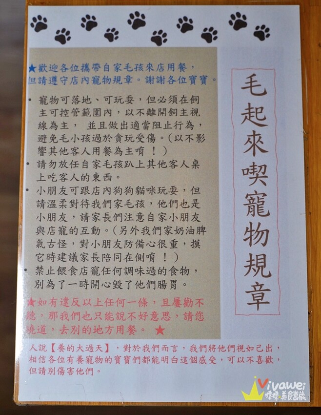 ▲如果你打算帶家裡的毛小孩來用餐,一定要先看過店家的寵物規章!寵物入店是可以落地、可以玩耍的,但是必須在飼主可控管的範圍內,不可以離開飼主的視線,也不能讓自己的毛小孩去吃其他桌客人的食物唷!