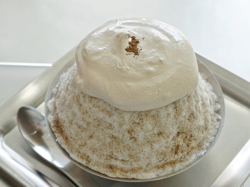 它就像是解構版的中式喜餅,刨冰內夾著有別於蜜芋頭的淡淡鹹度芋頭泥,選用屏東大甲芋頭,能嚐到些芋頭塊狀。