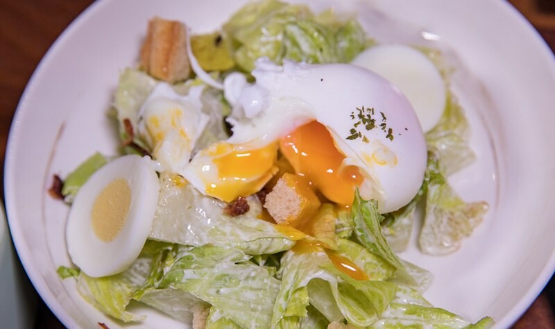 沙拉還符上一顆半熟溫泉蛋,麵包的選項頗多,有奶油和桌上的果醬可以搭配。