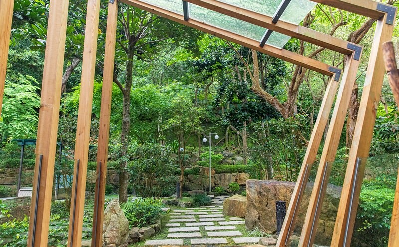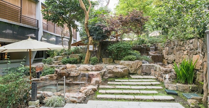 沿著大廳側門而出是一處讓人視覺一亮的庭園,這裡也是呆水戶外溫泉的入口。