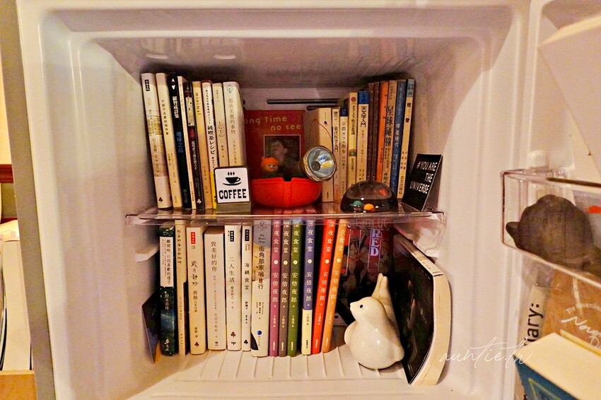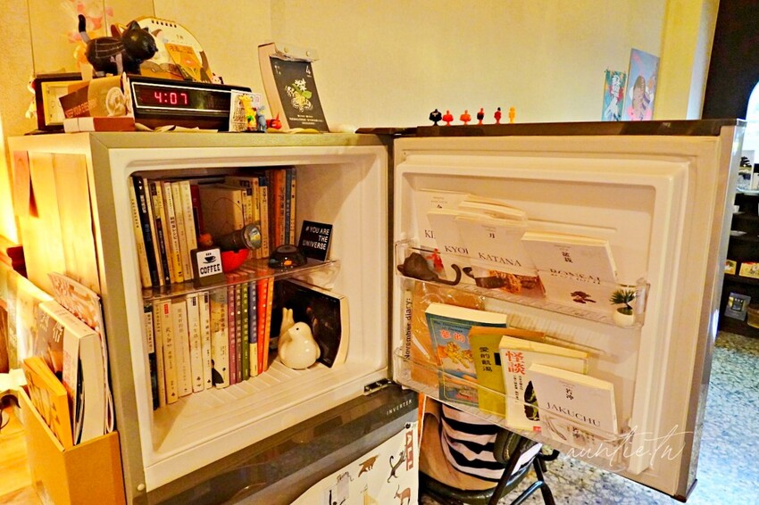 店內的書籍很多,看到客人一直開冰箱想說到底裡面是什麼,原來冰箱裡也都是書耶,冰箱變成書櫃了!