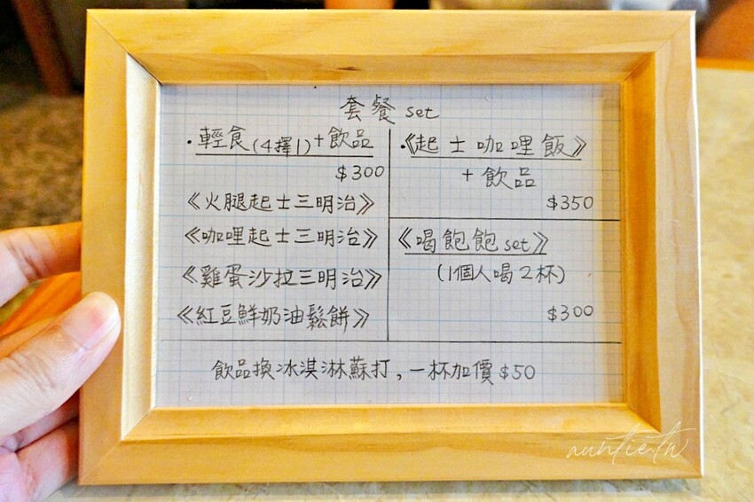 店裡位子不多,假日客滿的話限時兩小時。菜單是用手寫的,看起來特別親切有溫度,有輕食三明治也有甜點,還有正餐,咖啡還有一個人喝兩杯300元的喝飽飽價格,其實真的不算貴。