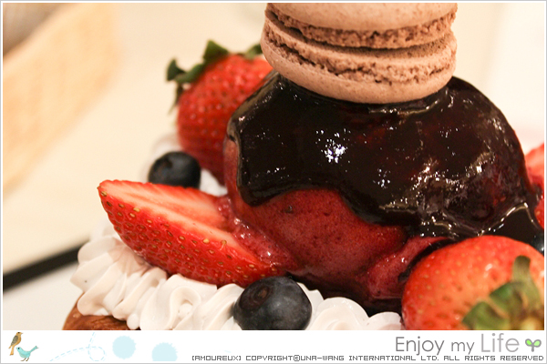 上頭還有顆巧克力馬卡龍與覆盆子冰淇淋,以及多種莓果做點綴