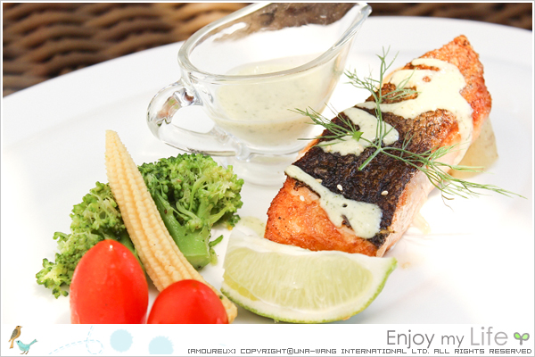 接著主餐一一上桌了!先送上桌的是嫩煎白芝麻鮭魚吻橄欖油漬蔬菜(主廚套餐)