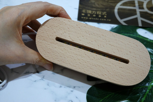 實木底座摸起來觸感厚實、光滑不刺手,凹槽裡有較省電的LED發光底座設計。