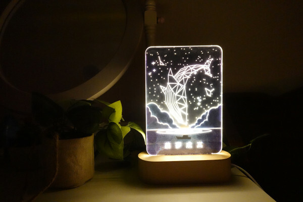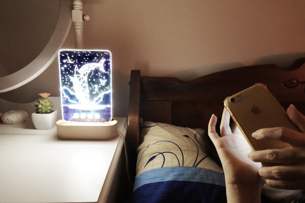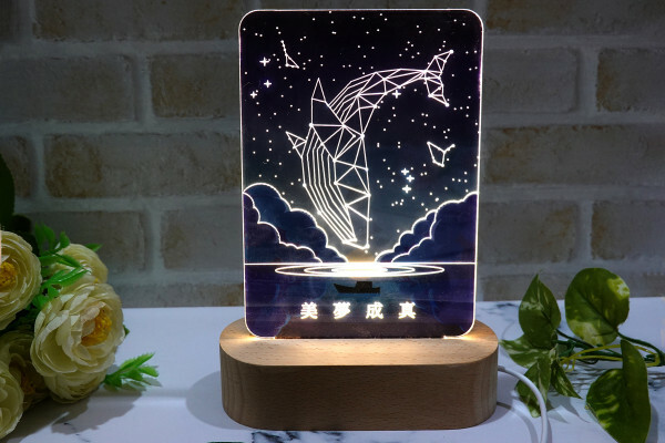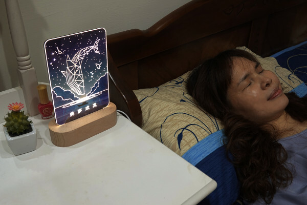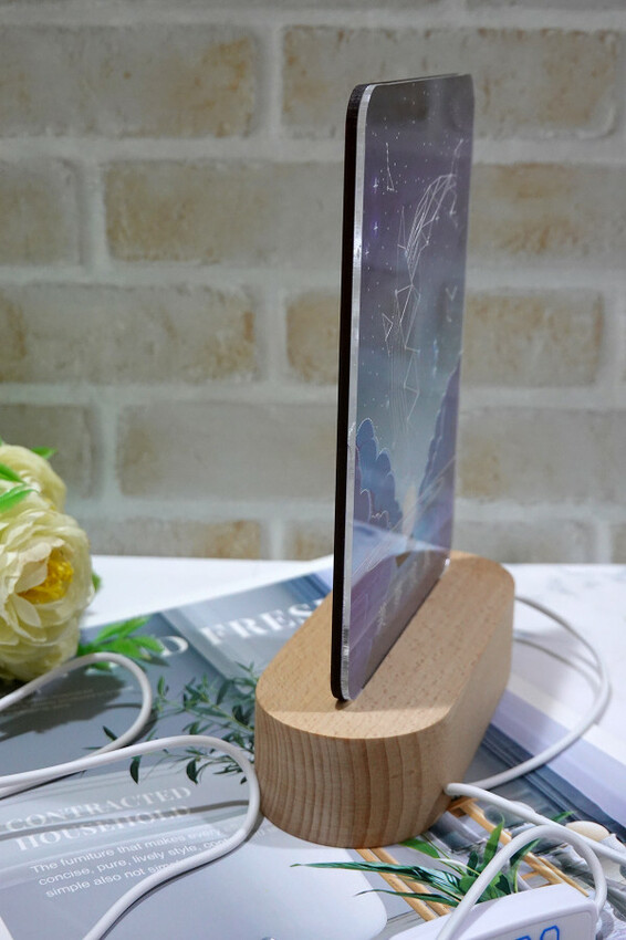 WOOD小夜燈的燈片是一片UV印刷彩色圖樣的木板、一片透明壓克力板組成的,將兩個燈片一起插進去實木底座的凹槽裡就能完成組裝,能輕鬆享有DIY的樂趣。
