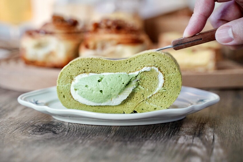 「日式濃焙茶捲」選用日本特級紫蘿蘭麵粉、彰化振楠牧場有機紅殼蛋來製作,口感更綿密細緻,鮮奶油也很滑順香濃!