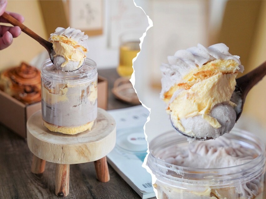 新品「芋泥布丁盒子」一口挖下去有多層次的口感,芋泥香甜不膩口,還有綿密滑順的布丁,搭配柔順蓬鬆的蛋糕體,真的是欲罷不能耶!