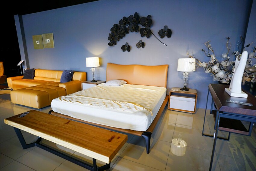 此款採用大地色系皮革,床頭板弧度符合人體曲線,包覆感十足,喜歡全牛皮床架的人這裡選擇不少。