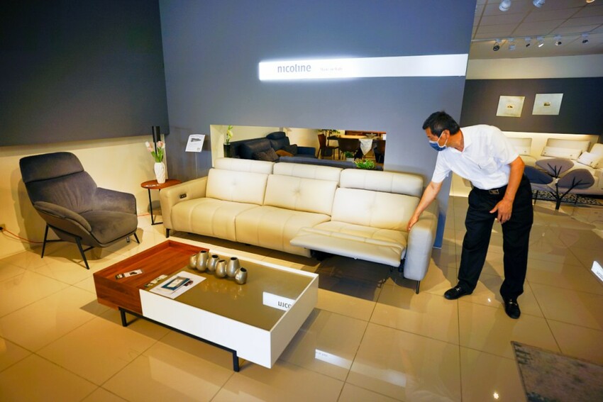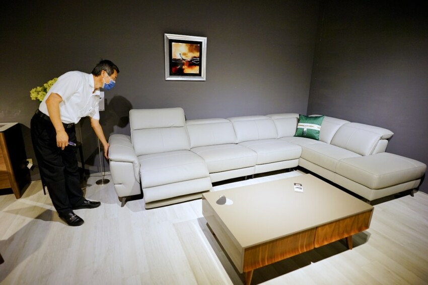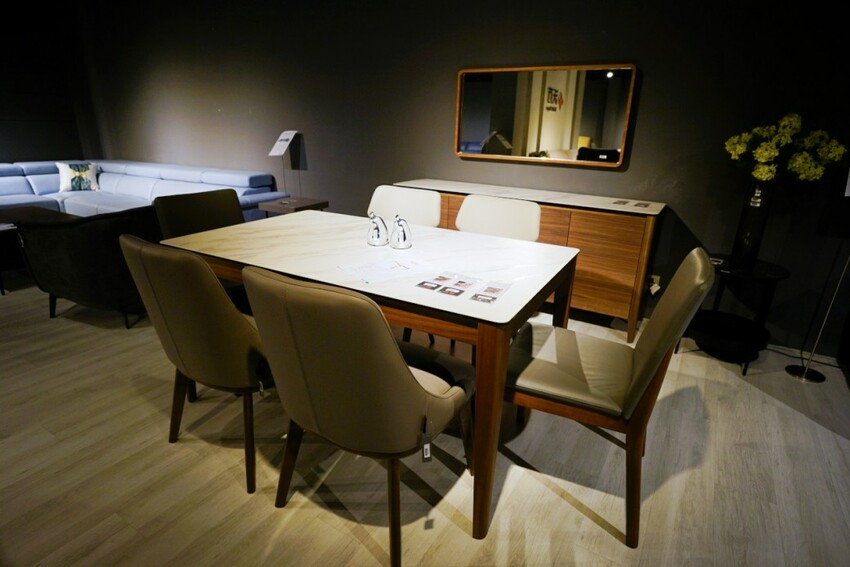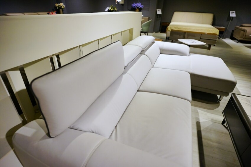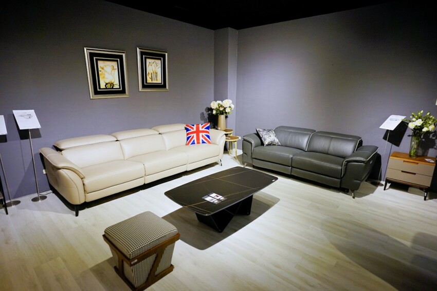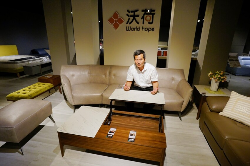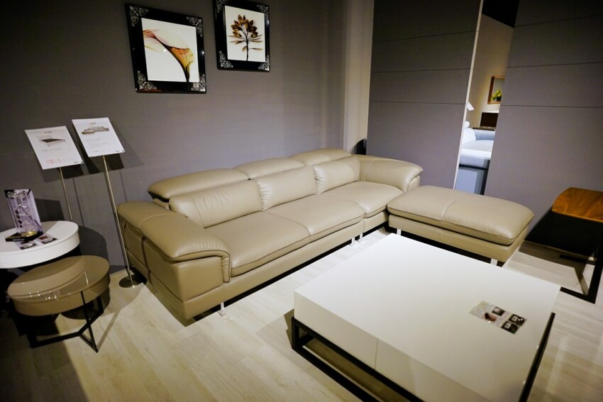 走上二樓展示空間,第一個介紹給我們的是晶華的自有品牌WORLD HOPE 沃荷,走的是比較年輕時尚風格路線,除了有一些特殊材質的應用外,電動牛皮沙發也是主打商品,其中一款全牛皮L型沙發,只要4萬多就可帶回家,比買布沙發更划算。