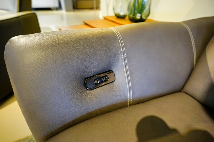 此款全牛皮沙發未配備電動開關,但有可調式頭枕功能;手把採倒V菱角設計有別於一般沙發,視覺上很特別,不管是坐著靠手,或是躺著靠頭都蠻舒適的。