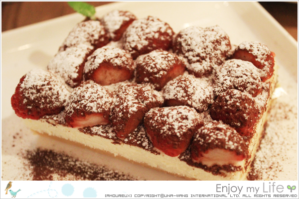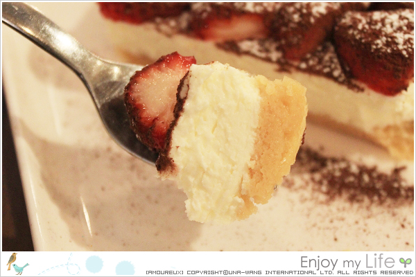 這蛋糕的層次真是豐富,從上而下是酸甜的草莓、可可粉、綿密的馬滋卡邦起司和私房的派皮