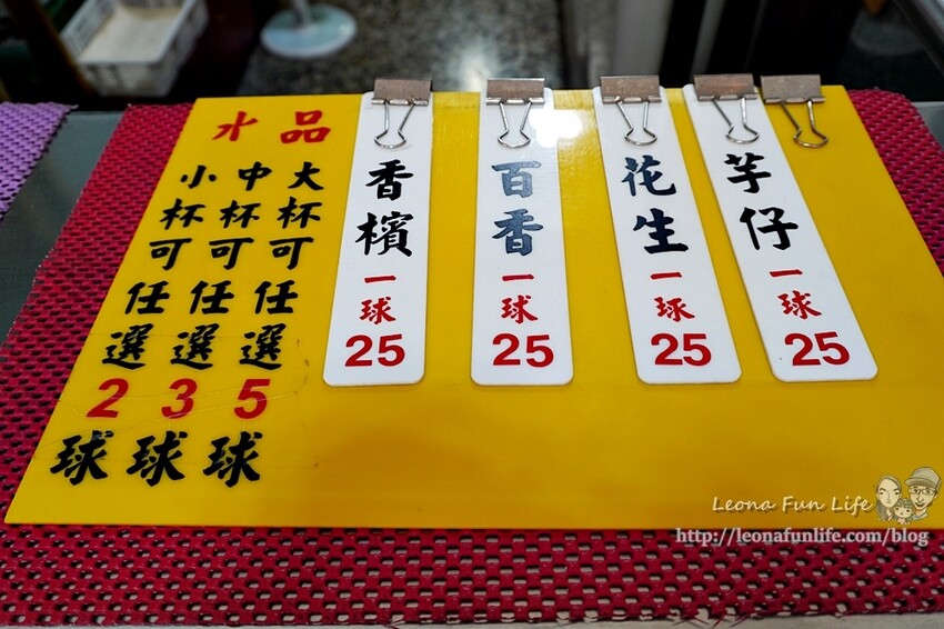 冰品口味有招牌芋仔冰、香檳牛奶冰、可可亞、百香果、花生都是一球$25,