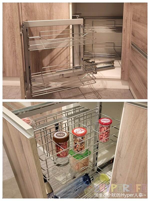 角落的櫃位也不浪費,可以旋轉的五金讓生活超方便。醬料區的櫃子也非常貼心分好格子囉