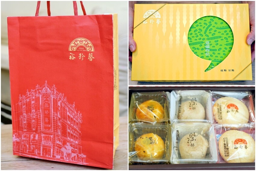 ▼「裕珍馨」的外盒採用鵝黃底搭配綠色的逗點,有”生活要逗點,閒逸有豆點”的涵義;提袋採用經典的大紅搭配黃色系,上頭還有店面的手繪插圖,看起來更增添歷史與古樸的趣味!裡頭一共有迷你奶油酥餅、紫玉酥、烏豆沙蛋黃酥等三種口味,都是採獨立包裝,方便保存與享用!