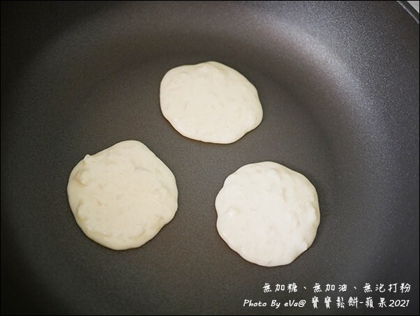 用湯匙把麵糊倒入平底鍋的高度要稍為低一些,因為麵糊裡有蘋果顆粒,麵團流動擴散會不太圓