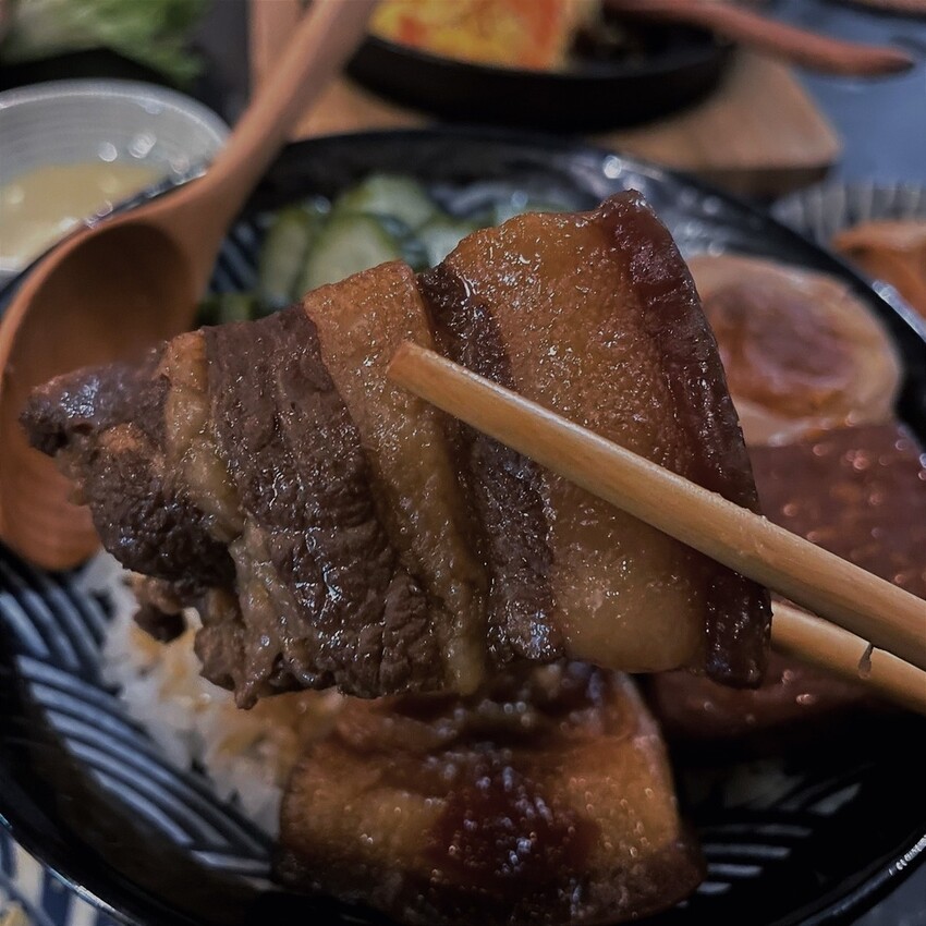 撲了兩大塊的控肉、一戳小黃瓜、豆干、溏心蛋,大概很難想像小酒館的主食居然是控肉飯吧?