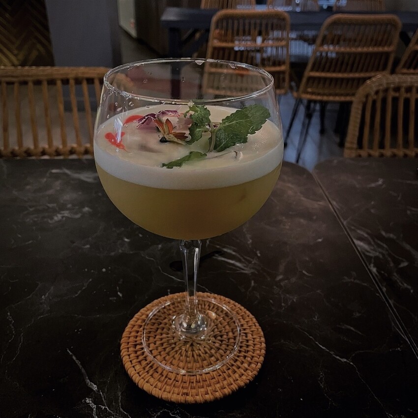 以茉莉花茶伏特加、柚子酒、檸檬、柳橙、茉莉花、蛋白調配成一杯調酒,這杯我覺得口感比幽靈騎士喝得出多層次感