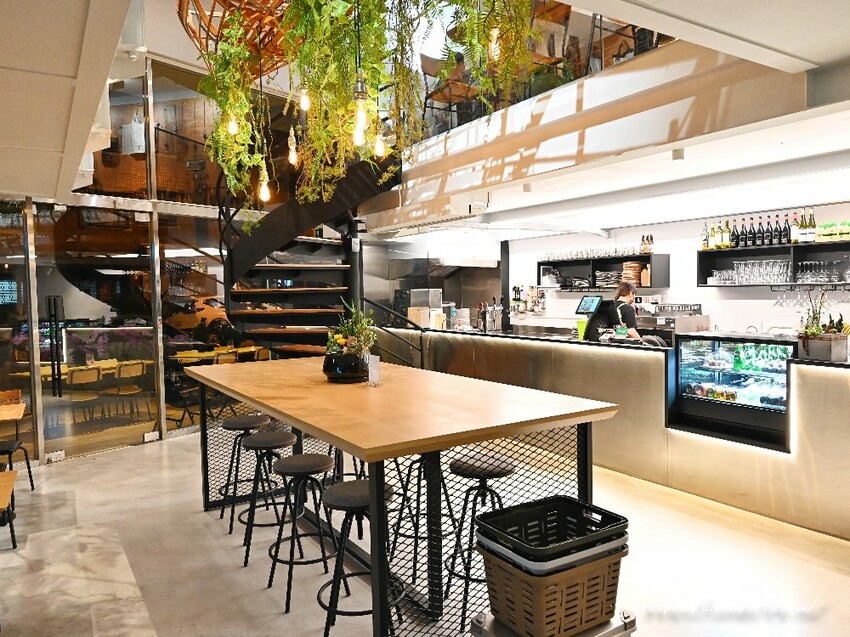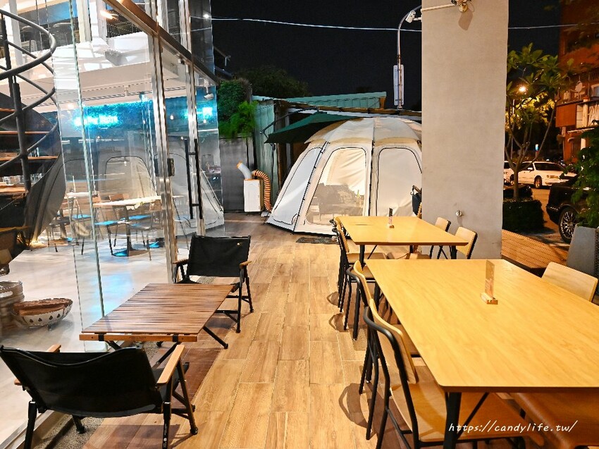 店裡頭採落地窗設計,從外頭看進來彷彿一間玻璃屋,一、二樓都有設置座位區,空間寬敞舒適,除了一般座位區,還有長型桌子可以容納多人聚餐,二樓除了座位區還有販售露營的配備及器具唷