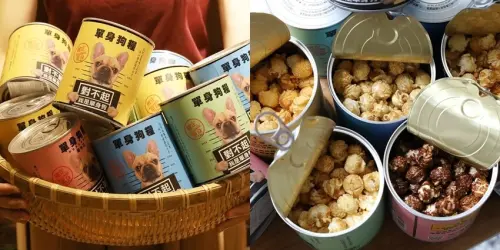 『新玉香食品豬飼料柑仔店』至今60幾年的品牌,已經傳承到第三代的手上,很多人都會覺得老食物到底有什麼方式讓更多年輕人知道,所以豬飼料柑仔店這一波以『單身狗罐頭』為包裝造型,裏頭則是很多對於小編來說是懷舊的零嘴,也有多種口味爆米花,超適合男女老幼的,也因為包裝特別也吸引很多來到台南旅行的遊客買來當伴手禮。