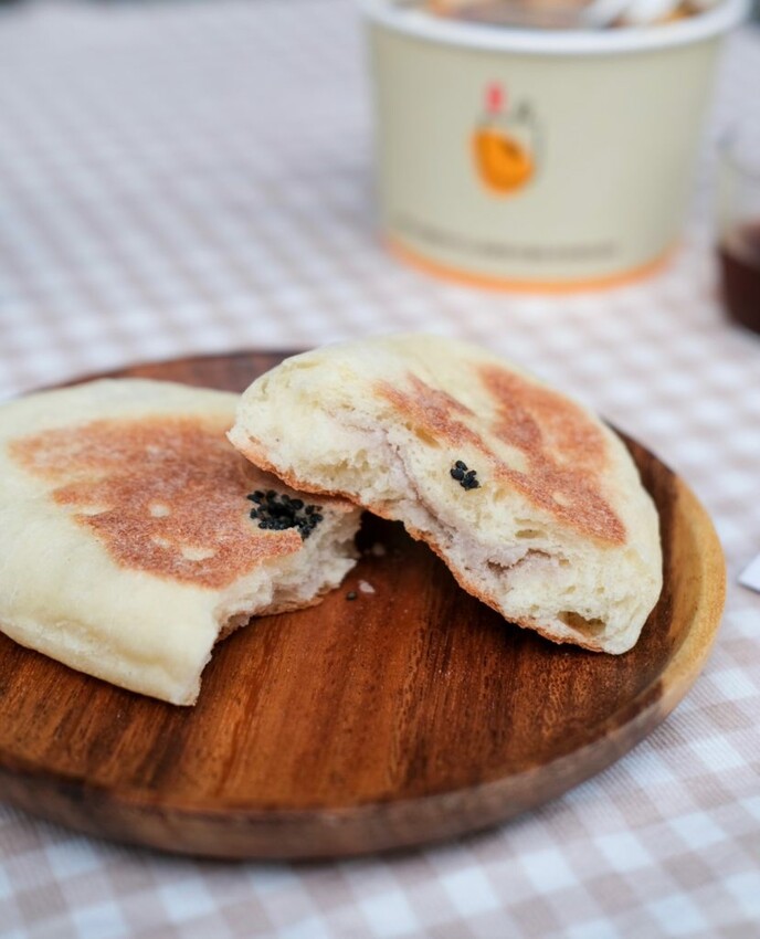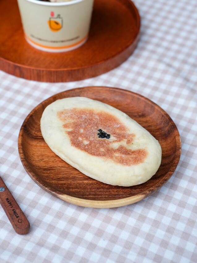 ▼每日限量售完為止的小時候大餅,共有原味、鹹味、紅豆、綠豆、花生、芝麻、芋頭等多種口味,蓬鬆彈性的餅皮不會油膩,越咬越能感受到麵粉香氣,內餡比例剛好,微甜的芋頭很有古早感,是簡單又樸實的點心~