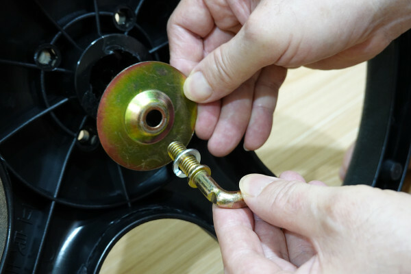 底座下方金屬座突出的向外面,鎖上螺絲、螺絲帽之後就能固定中柱,將腳座固定。